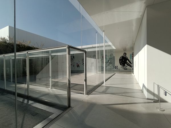 21美では無料ゾーンと有料ゾーンを白い枠の付いた大きなガラス扉で仕切っていて、作品の搬出搬入時にはガラス扉を開けて展示替えをしています。
