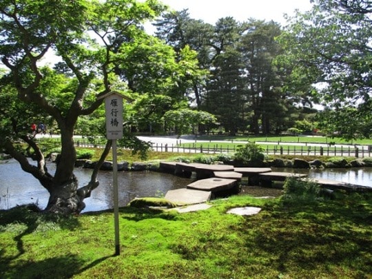 金沢城公園から見て最も奥に位置する山崎山のふもとを出発点として、広大な日本庭園を逆S字に曲がりながら、ことじ灯籠で知られる霞ヶ池へと流れ込んでいきます。