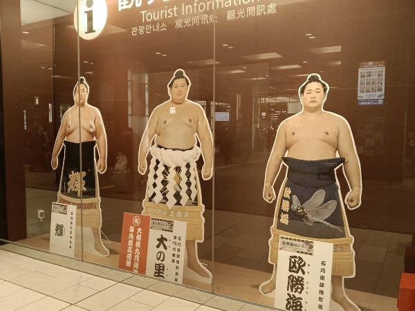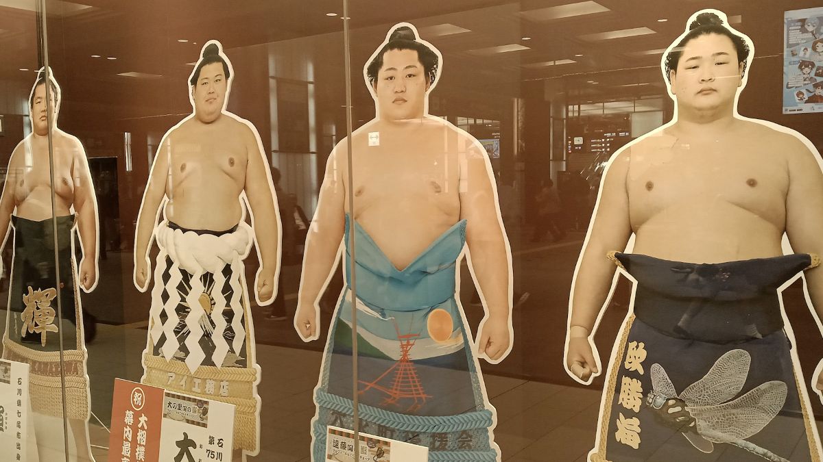 金沢駅東口 (兼六園口) の金沢駅観光案内所の前には、大相撲の郷土力士の等身大パネルが展示されています。横綱・大の里も展示されていることから、相撲好きの観光客の方にとっては、ちょっとした撮影スポットになっています。
