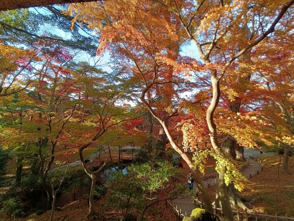 兼六園では紅葉が見頃を迎えています。例年に比べて色付きが遅いように感じていましたが、11月も中旬を過ぎてしっかりと色付きました。