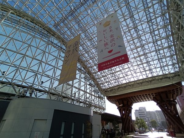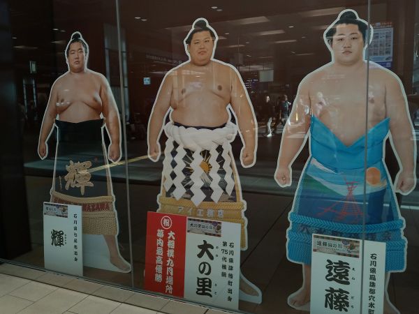 少し古い話になりますが、大相撲九月場所で横綱・大の里が昇進後初の優勝を飾りました。金沢駅の観光案内所前に設置されている大の里の等身大パネルには「祝!九月場所優勝」のプレートが設置されました。