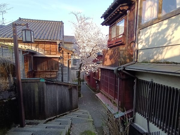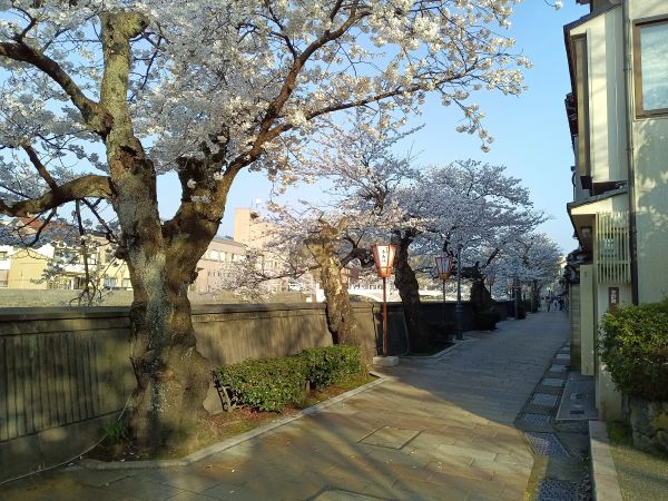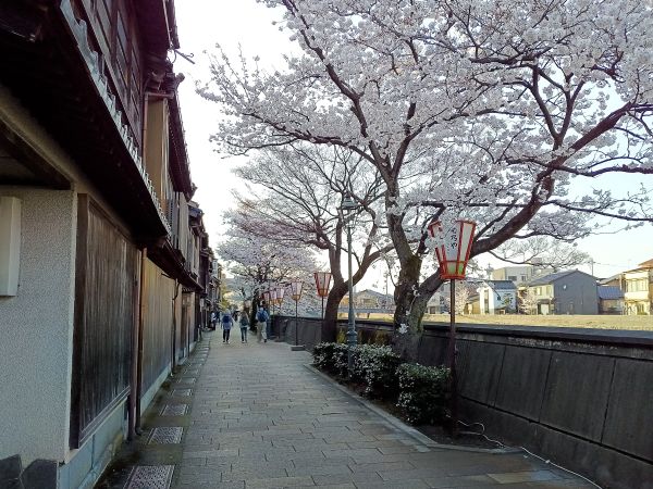 金沢の川沿いの桜スポットとして最初にご紹介したいのが、浅野川に面する主計町茶屋街です。主計町と書いて「かずえまち」と読みます。