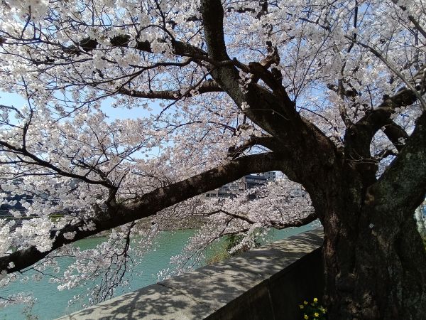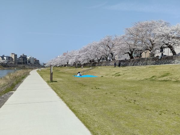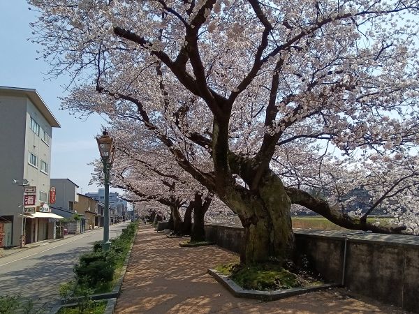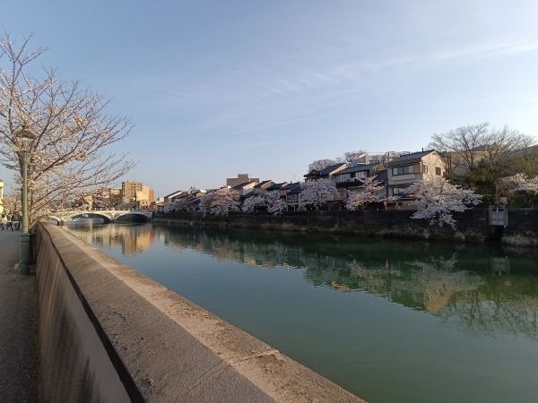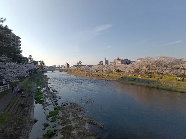 曲がりくねりながらゆっくりと流れる姿から「女川」と称される浅野川。一方の犀川は、一直線で流れの早い形状から「男川」と称されています。男川という通称を念頭に置いて見ると、確かに、犀川沿いの桜は豪快に咲いています。
