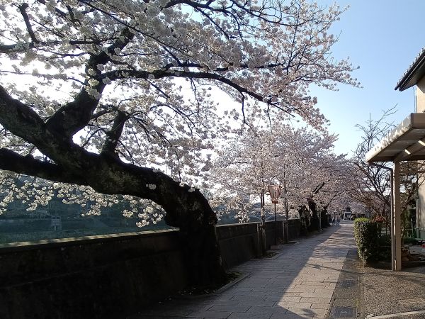 茶屋建築が立ち並ぶ浅野川沿いの表通りでは、樹齢を重ねた桜の木が、今年もピンクの花を咲かせてくれました。お花見の時期に掲出される、芸妓さんの名前が入った雪洞 (ぼんぼり) が茶屋街の風情をさらに際立たせています。