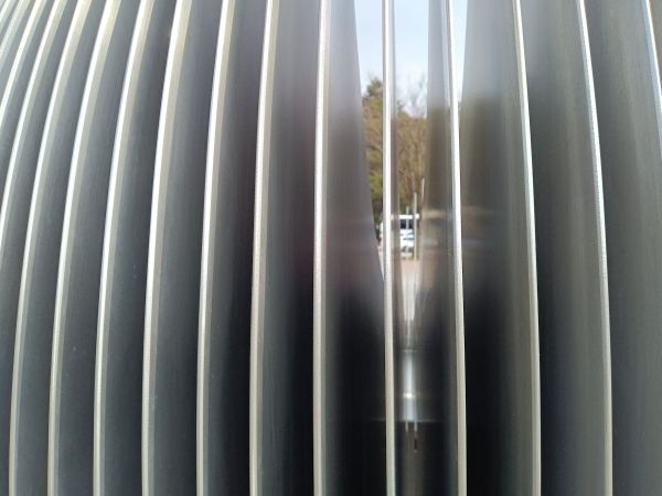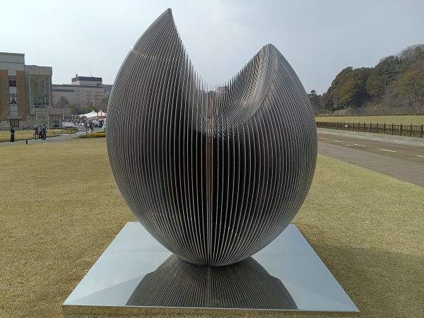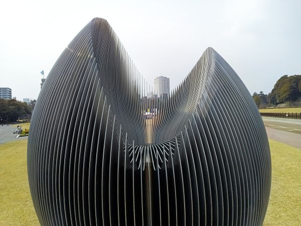 北國新聞の記事を見て、私も展示されたオブジェを見てきました。花が開く瞬間のようにも見える作品の谷間から、北國新聞本社が見えていることが印象的でした。