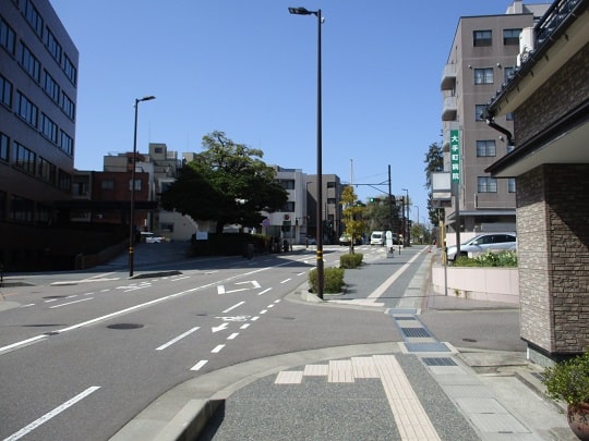 T字路の橋場交差点のシンボルは金沢文芸館というレトロな雰囲気の白い洋風建築の建物で、T字路を直進すると兼六園下交差点です。ちなみに、T字路を右に行くと近江町市場のある武蔵交差点です。