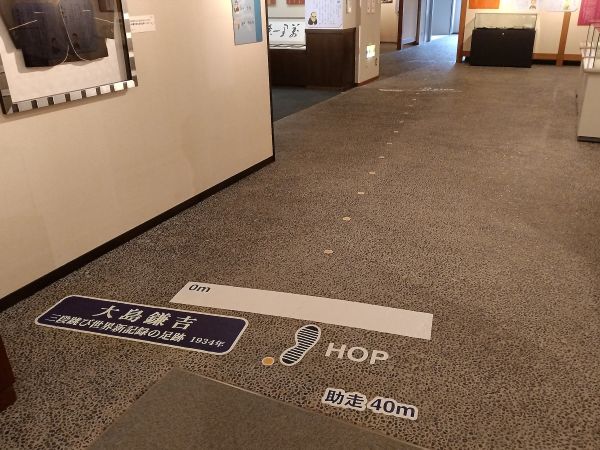 さらに1934年には15m82cmを跳び当時の世界新記録を樹立しました。金沢ふるさと偉人館の床には、大島氏の世界記録15m82cmの長さを再現しています。