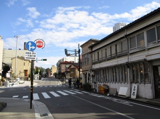 尾山神社前交差点から百万石通りに出ると、近江町市場まで南町(みなみちょう)のビジネス街が続きます。かつて金沢の女性たちの憧れの勤務地と言えば南町でした。当然ながらオフィスビルが並んでいますが、1階には陶器や手まりなどの工芸品店が見られます。