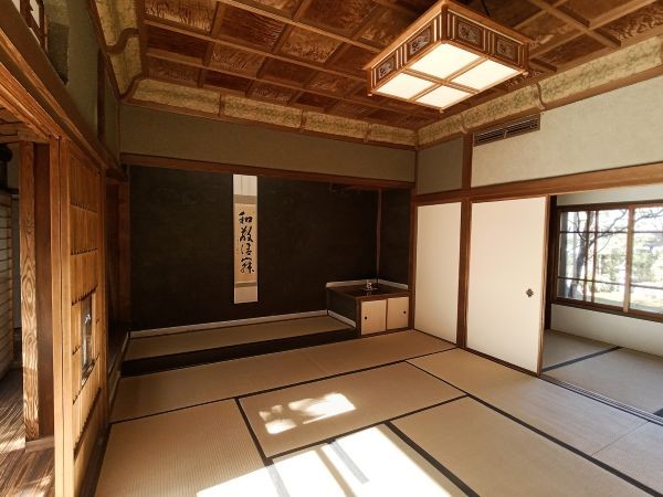 また、金沢で名士と呼ばれる人物を招いたであろう客間やお茶室が残されています。客間では忘れずに天井もご覧ください。客間の天井は旧加賀藩で最も格式が高いとされる「折上げ格天井」(おりあげごうてんじょう) となっています。