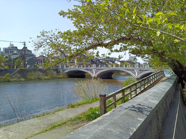 秋聲のみちには綺麗な桜並木が整備されており、木々の間からはレトロなアーチが特徴の浅野川大橋が顔をのぞかせています。浅野川大橋は1922年(大正11年)に架けられた橋で、風情あるデザインが地元の人たちに親しまれてきました。