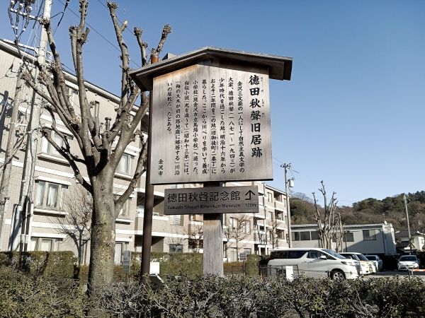 秋聲記念館を出るとしばらくは閑静な住宅街で、住宅街を過ぎたあたりに「徳田秋聲旧居跡」と記された記念碑があります。旧居跡の説明版は浅野川大橋の方を向いていますので、徳田秋聲記念館から歩かれる際は見落とさないように気を付けてください。